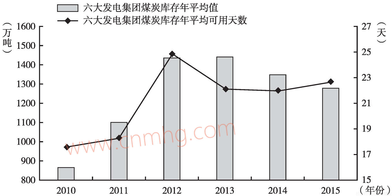 2014年,六大發(fā)電集團煤炭庫存年平均值約為1349.64萬噸,年平均可用天數(shù)為21.97天;秦皇島港煤炭庫存年平均值約為637.28萬噸,同比增加0.05%。