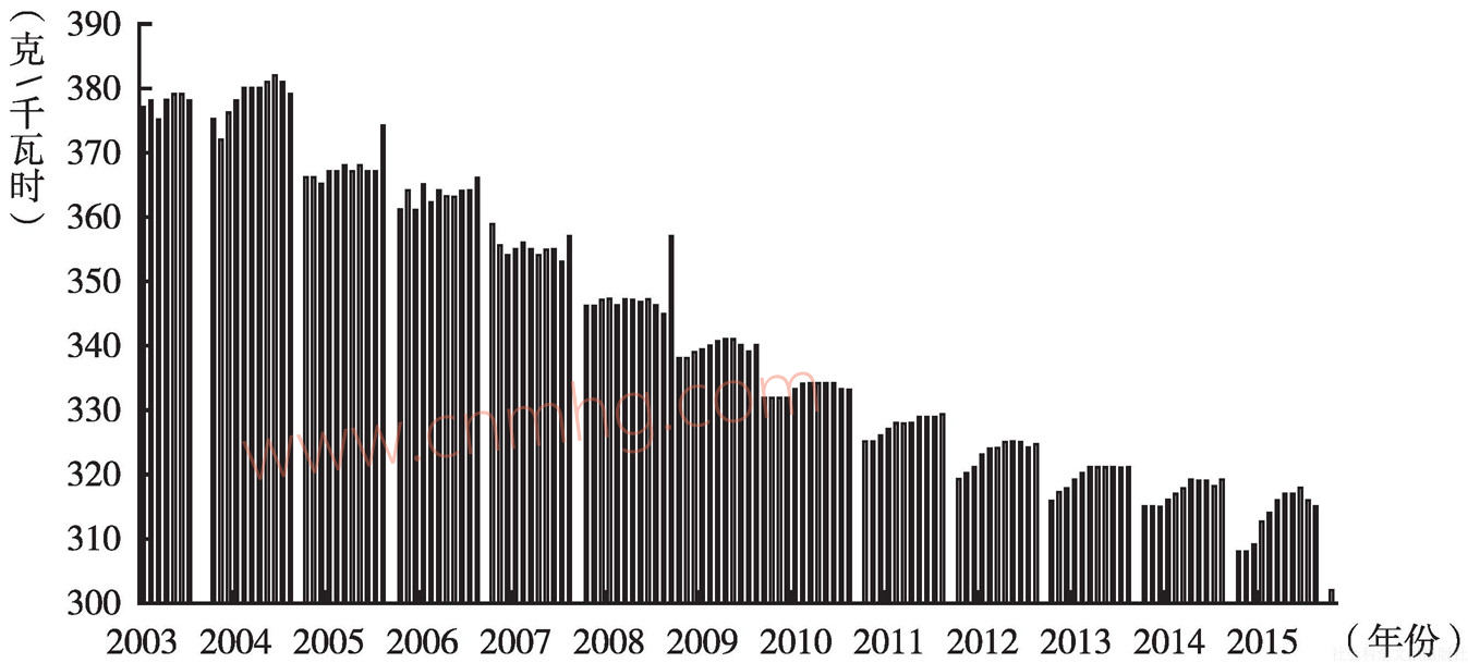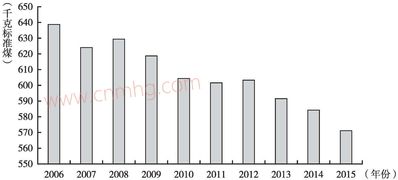 另外,隨著科學技術的進步和管理水平的提高,中國電力和鋼鐵能源利用率逐漸提高,耗煤指標逐漸好轉(zhuǎn),也在一定程度上壓制中國煤炭需求的增長空間。2015年1~12月,中國供電煤耗率累計值為315克/千瓦時,同比降低1.25%(見圖33)。2015年中國噸鋼能耗571.85千克標準煤,同比降低2.20%(見圖34)。下游行業(yè)煤耗的下降說明中國在環(huán)保排放上取得了一定成效,但是目前來看環(huán)保壓力仍是有增無減。
