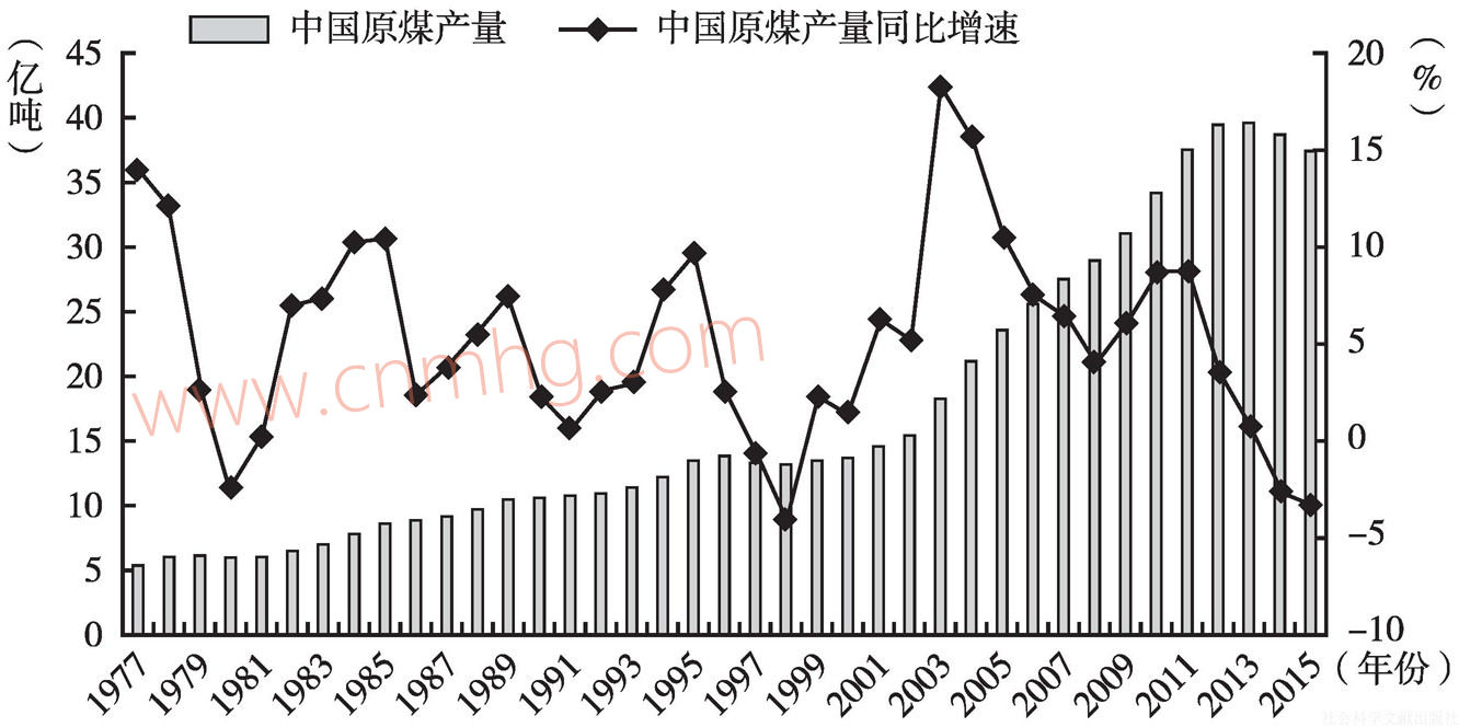 過去五年,中國原煤產(chǎn)量絕對值經(jīng)歷了比較慘烈的“牛熊轉(zhuǎn)換”期,產(chǎn)量同比增速逐漸下滑,其中近兩年同比增長降為負數(shù),有的煤炭企業(yè)被迫或主動采取限產(chǎn)或停產(chǎn)措施,合并重組意愿增強。2011年,中國原煤產(chǎn)量約為37.64億噸,同比增長8.81%;2012年,中國原煤產(chǎn)量約為39.45億噸,同比增長4.81%;2013年,中國原煤產(chǎn)量約為39.74億噸,同比增長0.74%;2014年,中國原煤產(chǎn)量約為38.74億噸,同比降低2.52%。國家統(tǒng)計局公布的《2015年國民經(jīng)濟和社會發(fā)展統(tǒng)計公報》顯示,2015年,中國原煤產(chǎn)量完成37.50億噸,同比降幅進一步擴大至3.3%,類似于亞洲金融危機期間中國煤炭產(chǎn)量的表現(xiàn),即1997年(-0.64%)和1998年(-4.03%)連續(xù)兩年負增長(見圖2)。