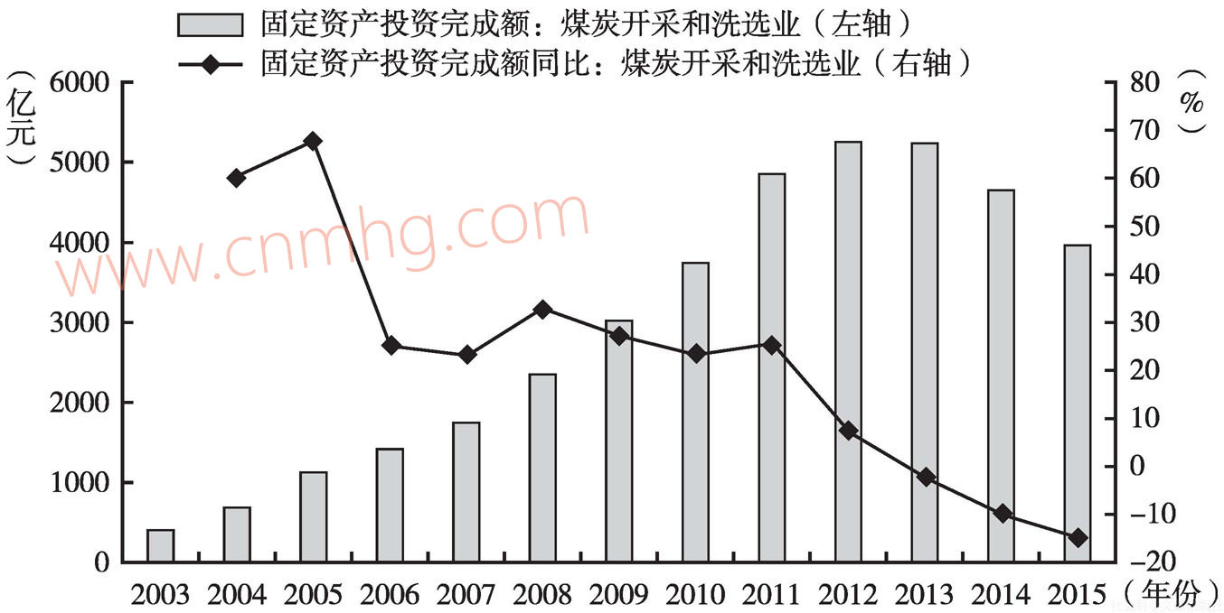 2015年1~12月,全國煤炭行業(yè)固定資產(chǎn)投資完成額累計值進一步下滑至4007.78億元,降幅明顯擴大。其中,2015年中國煤炭開采和洗選業(yè)民間固定資產(chǎn)投資完成額累計值為2281.44億元。