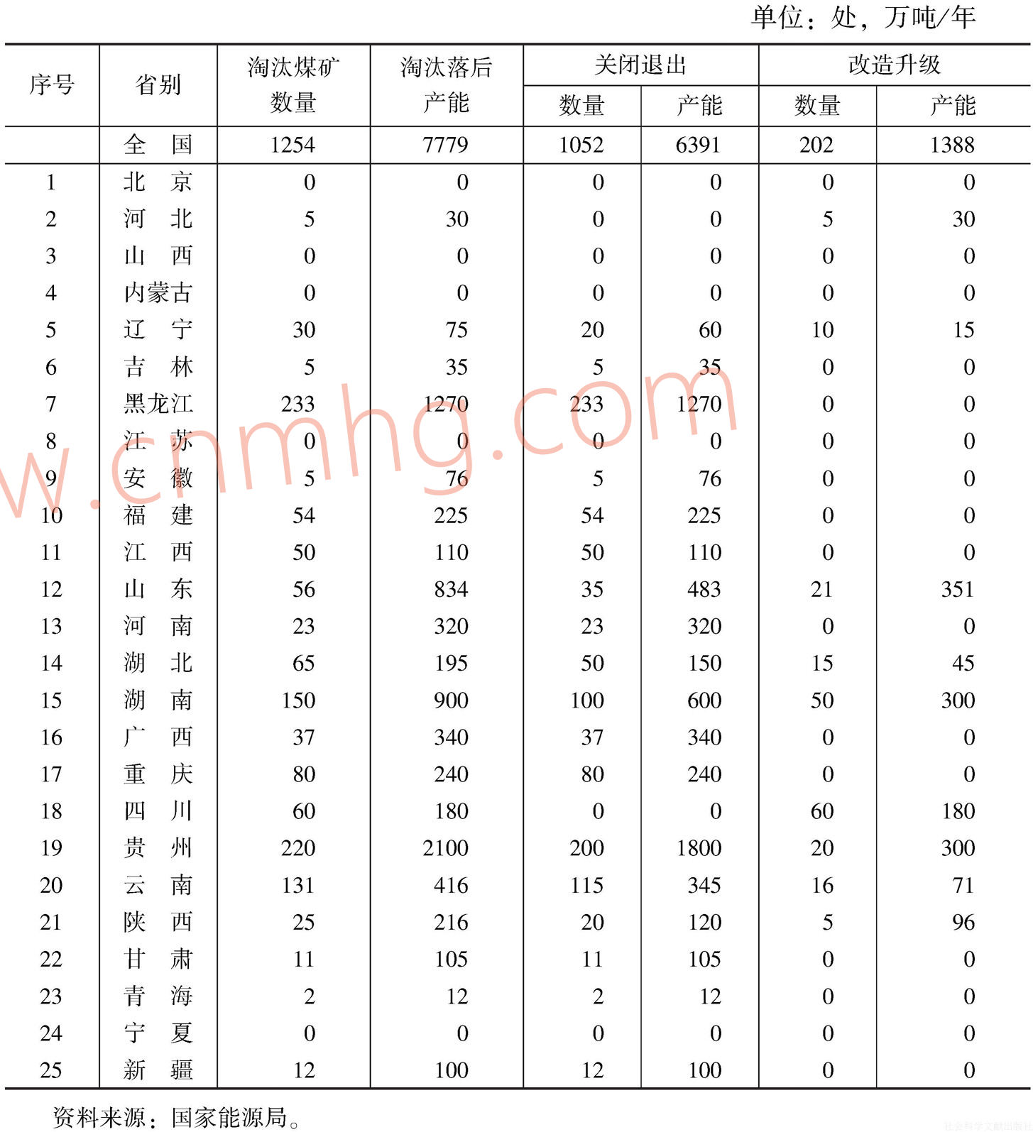 2015年3月26日,國家能源局和國家煤礦安監(jiān)局聯(lián)合發(fā)布的《國務院關于進一步加強淘汰落后產(chǎn)能工作的通知》要求,淘汰煤炭落后產(chǎn)能是優(yōu)化煤炭產(chǎn)業(yè)結(jié)構(gòu)的重要手段,是控制煤炭總量的重要舉措,對轉(zhuǎn)變煤炭發(fā)展方式、提高煤炭生產(chǎn)力水平具有重要意義。各地要充分認識此項工作的重要性,加強組織領導,采取切實有效措施,加大監(jiān)督檢查力度,加快工作進度。2015年中國擬淘汰煤炭落后產(chǎn)能計劃:計劃淘汰煤礦數(shù)量1254處,合計淘汰落后產(chǎn)能約7779萬噸/年,其中,關閉退出礦井1052處,淘汰產(chǎn)能6391萬噸/年,占比為82%;改造升級礦井202處,淘汰產(chǎn)能1388萬噸/年,占比為18%。從表2來看,北京、山西、內(nèi)蒙古、江蘇、寧夏基本完成淘汰落后小型煤礦任務。