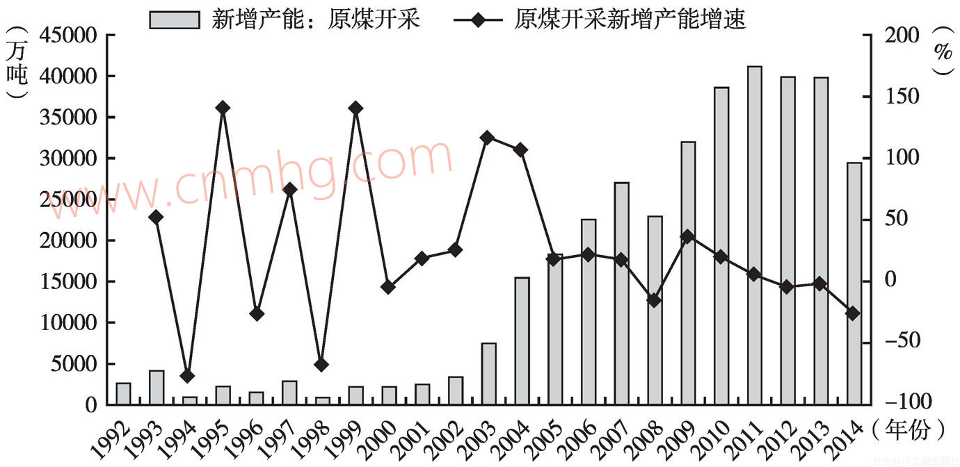 一般來說,煤炭產(chǎn)能變化與煤炭行業(yè)固定資產(chǎn)投資總體上呈正相關關系。國家統(tǒng)計局的數(shù)據(jù)顯示,自2001年至2014年,中國煤炭開采和洗選業(yè)固定資產(chǎn)投資累計完成3.54萬億元,平均每年投資超過2500億元;中國原煤累計新增產(chǎn)能達到33.87億噸,平均每年新增產(chǎn)能約為2.44億噸。不過,隨著近兩年煤炭行業(yè)固定資產(chǎn)投資快速下滑,隨后幾年內(nèi)中國原煤新增產(chǎn)能總體上穩(wěn)中趨降,2014年下跌至29545.23萬噸,整體下滑幅度達到28.43%,尤其是2014年同比降幅就高達25.98%(見圖1)。從絕對值來看,2011年中國原煤新增產(chǎn)能達到最高峰,預計“十三五”期間很難超過這一峰值。