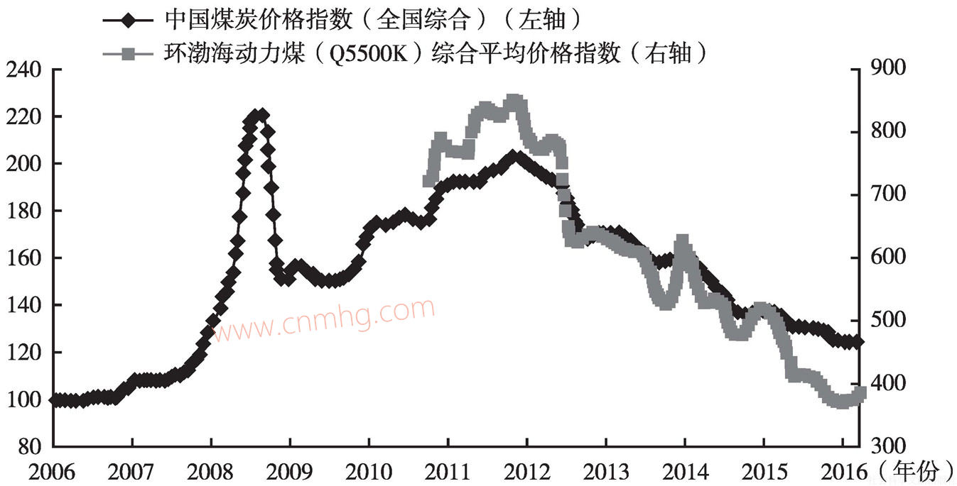 截至2015年末,中國煤炭價格指數(shù)(全國綜合)下降了12.70點至125.10點,同比增幅為-9.22%;環(huán)渤海動力煤(Q5500K)綜合平均價格指數(shù)下降了153.00點至372.00點,同比增幅為-29.14%。