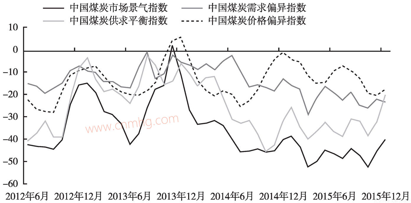 中國煤炭工業(yè)協(xié)會的數(shù)據(jù)顯示,2015年1~12月,中國煤炭市場景氣指數(shù)維持在-52.40~-38.60,均在-30一線之下,意味著全年中國煤炭市場處于“過冷”的狀態(tài)。其中,在基礎指標中,2015年2~11月,中國煤炭供求平衡指數(shù)維持在-40.00~-30.90,均在-30一線之下,意味著中國煤炭市場處于“嚴重過剩”的狀態(tài),1月和12月中國煤炭供求平衡指數(shù)為-30~-20,意味著中國煤炭市場處于“供過于求”的狀態(tài);1~12月中國煤炭需求偏異指數(shù)“先回升,后回落”,總體維持在-25~-15,意味著中國煤炭市場需求上半年總體處于“基本平穩(wěn)”狀態(tài),下半年總體處于“萎縮”的狀態(tài);1~12月中國煤炭價格偏異指數(shù)維持在-20.50~-4.10,絕大多數(shù)月份處于-20~-10,意味著中國煤炭市場價格處于“平穩(wěn)回落”的狀態(tài)(見圖25)。