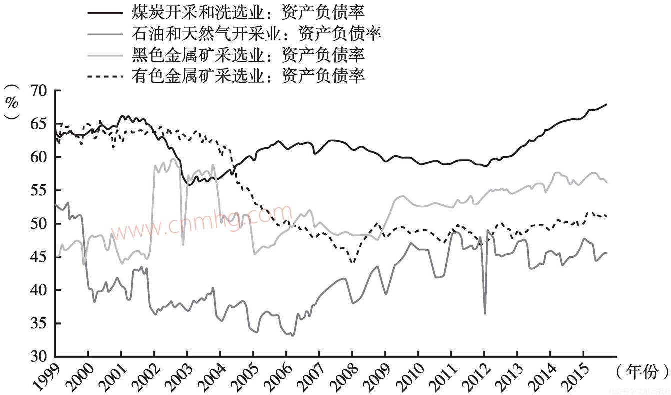 值得注意的是,與中國石油和天然氣開采業(yè)、有色金屬礦采選業(yè)、黑色金屬礦采選業(yè)這三大礦產(chǎn)開采業(yè)的資產(chǎn)負債率相比,中國煤炭開采和洗選業(yè)的資產(chǎn)負債率最高,上升速度最快,已經(jīng)創(chuàng)出了歷史新高,尤其是最近四年來(見圖17),未來幾年進一步上升的空間已經(jīng)越來越窄。換言之,中國煤炭業(yè)在四大礦產(chǎn)開采業(yè)中遇到的困難最重,從傳統(tǒng)融資渠道獲取資金最為艱難,未來面臨更為嚴峻的考驗。