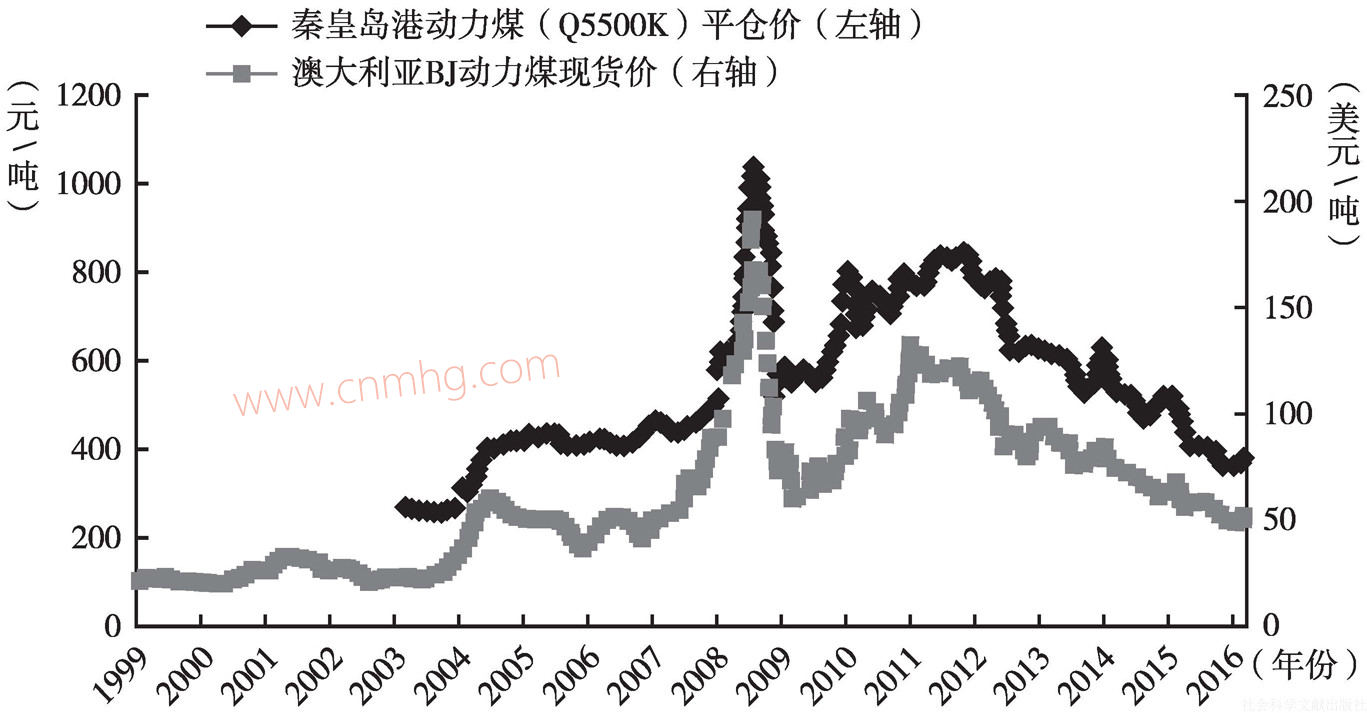 更確切的,從國內(nèi)外動力煤現(xiàn)貨價格年度平均值來觀察,國外煤炭價格下跌幅度大于國內(nèi)煤炭價格。2011~2015年,澳大利亞BJ動力煤現(xiàn)貨價和秦皇島港動力煤(Q5500K)平倉價分別下跌了51.28%和48.13%,每年也均以雙位數(shù)的速度持續(xù)下跌(見表4)。