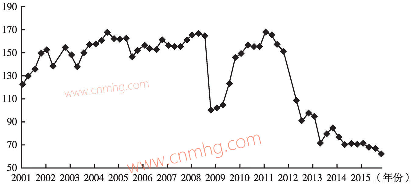 2011年3月,中國煤炭開采及洗選業(yè)企業(yè)景氣指數(shù)在經(jīng)歷金融危機之后創(chuàng)出歷史新高,達到168.50。2011~2013年,中國煤炭開采及洗選業(yè)企業(yè)景氣指數(shù)呈現(xiàn)急劇快速下滑的態(tài)勢,由168.50大幅下滑至84.72,其間于2012年9月跌破了全球金融危機時期的最低點(100.40)。2014~2015年,中國煤炭開采及洗選業(yè)企業(yè)景氣指數(shù)呈現(xiàn)逐漸緩慢下降的態(tài)勢,由77.40穩(wěn)步下滑至62.00,在這期間沒有任何明顯的反彈(見圖24)。