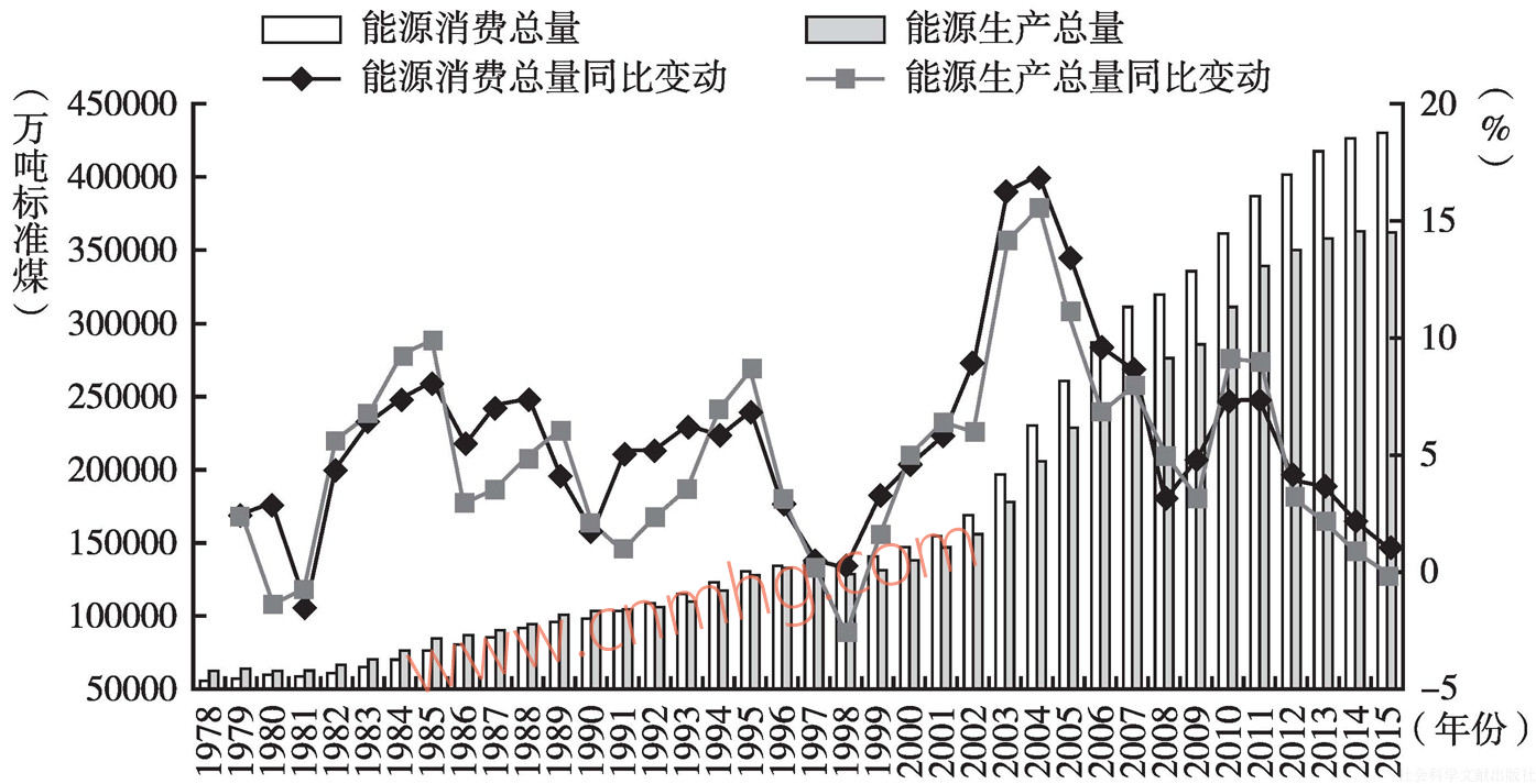 圖27 改革開放以來中國能源消費總量和生產(chǎn)總量及其變動趨勢