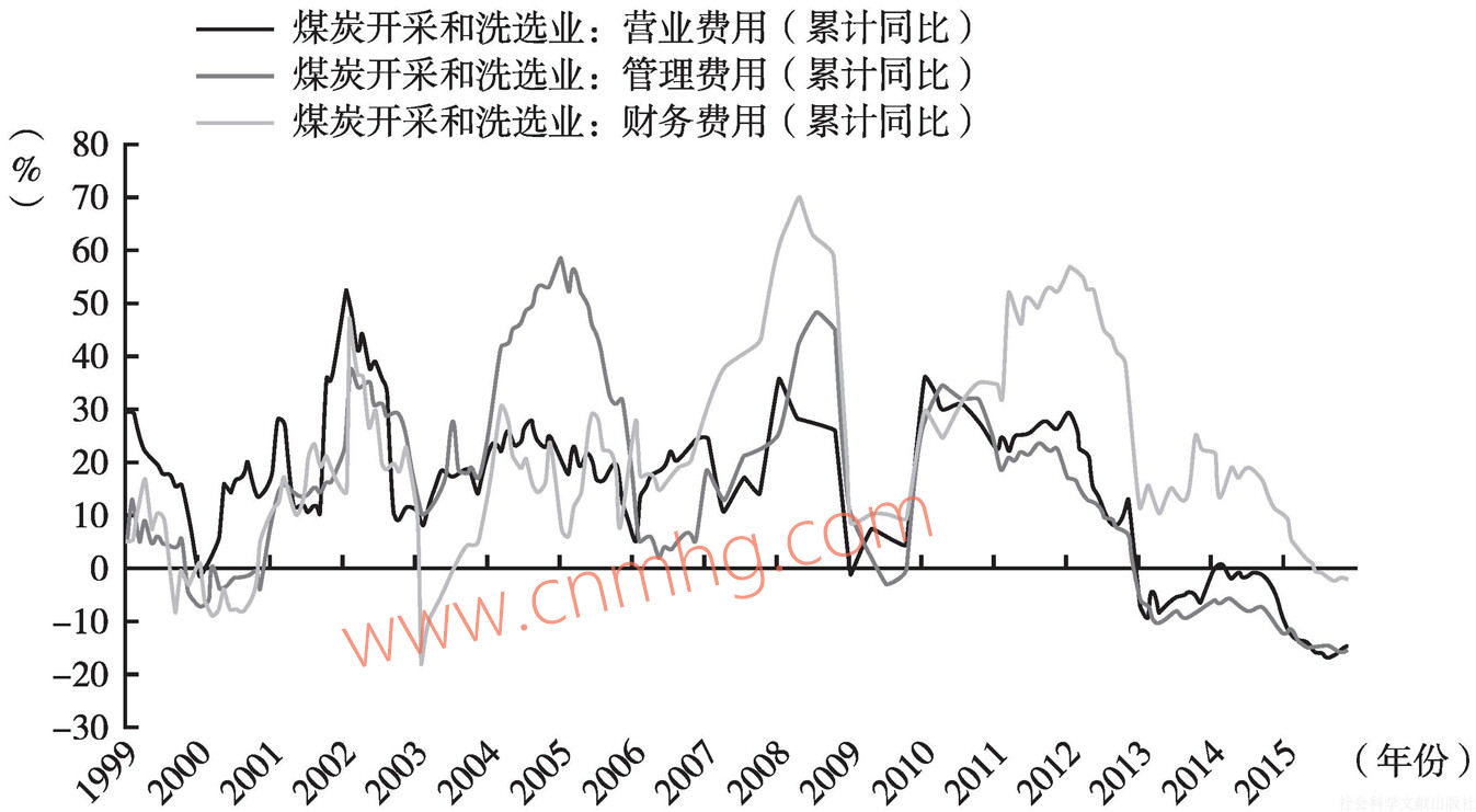 國家統(tǒng)計局的數(shù)據(jù)顯示,過去五年中國煤炭開采和洗選業(yè)主營業(yè)務成本累計值先升后降,同比增速高位下滑;營業(yè)費用、管理費用不斷下滑,累計同比增速連續(xù)三年為負數(shù);財務費用高位快速下滑,2015年同比增速首度為負數(shù);稅金總額總體下滑,同比增速為負數(shù),但降幅有所放緩。以上各項同比增速指標均已經(jīng)由正轉(zhuǎn)負,大多數(shù)指標惡化程度已經(jīng)超過了上一輪“大牛市”啟動時期的最低水平(見圖12、圖13和圖14)。
