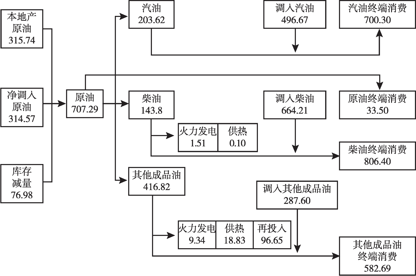圖3 2016年河南省油品能流(單位:萬噸)