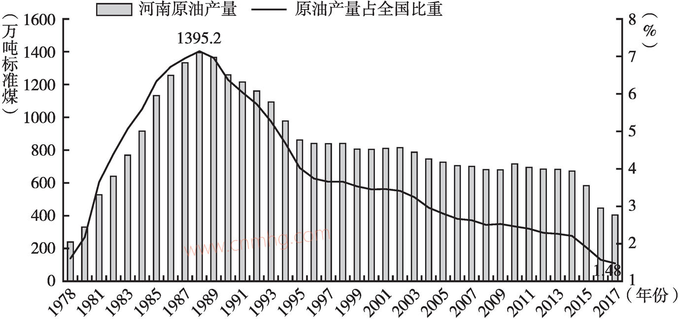 1978~2017年,河南原油生產(chǎn)總量從239.4萬噸標(biāo)準(zhǔn)煤增至403.6萬噸標(biāo)準(zhǔn)煤,全省原油產(chǎn)量總體呈先升后降的發(fā)展態(tài)勢,其中,1978~1988年屬于原油生產(chǎn)上升期,原油產(chǎn)量在1988年達(dá)到峰值1395.2萬噸標(biāo)準(zhǔn)煤,占當(dāng)年全國產(chǎn)量的7.14%。1988年之后,原油生產(chǎn)量逐年下降,其中1988~1995年和2014~2017年為兩個快速下降期,2017年全省原油生產(chǎn)量僅為全省峰值的28.9%,產(chǎn)量占全國原油產(chǎn)量的1.48%(見圖1)。