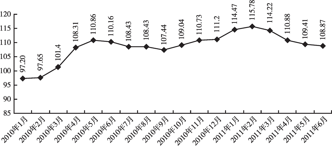 2010年和2011年上半年,黑色金屬行業(yè)原材料、燃料、動(dòng)力購進(jìn)價(jià)格指數(shù)呈現(xiàn)波動(dòng)中上行的態(tài)勢(shì)。先由2010年1月的97.2的低位一路飆升至2010年5月的110.86,此后緩慢回落至9月的107.44,之后一輪上漲的最高點(diǎn)出現(xiàn)在2011年2月份的115.78,隨后幾個(gè)月逐步回落企穩(wěn)于110左右(見圖3-5)。2010年以來,鋼鐵生產(chǎn)用鐵礦石、煤炭、焦炭等原燃材料價(jià)格繼續(xù)上漲,特別是進(jìn)口鐵礦石價(jià)格,由于國外礦山企業(yè)的壟斷,即使在鋼材價(jià)格回落的情況下,進(jìn)口鐵礦石價(jià)格也是呈不斷上漲,同時(shí)還帶動(dòng)國內(nèi)鐵精礦價(jià)格居高不下,煤炭價(jià)格也是呈上漲走勢(shì),給企業(yè)生產(chǎn)經(jīng)營帶來較大的成本壓力。