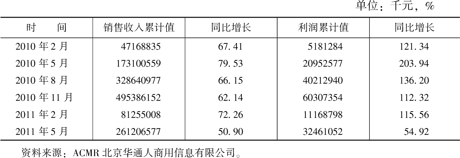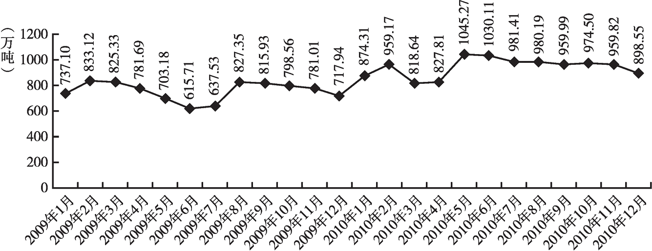 2010年,我國粗鋼產(chǎn)量為62665.4萬噸,同比增長10.36%;生鐵產(chǎn)量為59021.8萬噸,同比增長8.55%;鋼材產(chǎn)量為79627.4萬噸,同比增長15%(表3-1)。2010年,鋼鐵行業(yè)產(chǎn)量增幅明顯放緩,生鐵、粗鋼、鋼材增幅較2009年的15.9%、13.50%和18.50%分別回落7.35、3.14和3.5個(gè)百分點(diǎn)。進(jìn)入2011年,鋼鐵產(chǎn)量增幅保持波動(dòng)中緩慢回升。6月,生鐵和粗鋼產(chǎn)量增幅較2010年末分別上漲1.0和0.3個(gè)百分點(diǎn),鋼材產(chǎn)量增幅較2010年末下降1.9個(gè)百分點(diǎn),2011年6月生鐵和粗鋼產(chǎn)量的月增幅達(dá)到近一年最高位,而鋼材產(chǎn)量的月增幅最高位出現(xiàn)在2011年2月(表3-2)。2010年10月以來,除個(gè)別月份,生鐵和粗鋼的月累計(jì)增幅已從十位數(shù)下降至個(gè)位數(shù),在2010年的8~9月連續(xù)三個(gè)月更是跌至負(fù)增長。究其原因,從2010年4月上旬開始,政府出臺(tái)了一系列嚴(yán)厲的房地產(chǎn)調(diào)控政策,而國內(nèi)生產(chǎn)的近50%的建筑鋼材,都是用于房地產(chǎn)市場(chǎng),由圖3-1可以看出,4月作為2010年鋼鐵產(chǎn)量的第一個(gè)轉(zhuǎn)折點(diǎn),產(chǎn)量增速急劇放緩。另一方面,2010年是落實(shí)“十一五”節(jié)能減排目標(biāo)的決戰(zhàn)年,年度減排目標(biāo)要實(shí)現(xiàn)全年下降5.2%,而鋼鐵行業(yè)占我國能源消費(fèi)的1/6~1/5,為確保節(jié)能減排目標(biāo),從8月底開始,河北、江蘇和浙江等地相繼對(duì)地區(qū)內(nèi)高耗能鋼鐵企業(yè)進(jìn)行限電限產(chǎn),并逐步向全國蔓延。