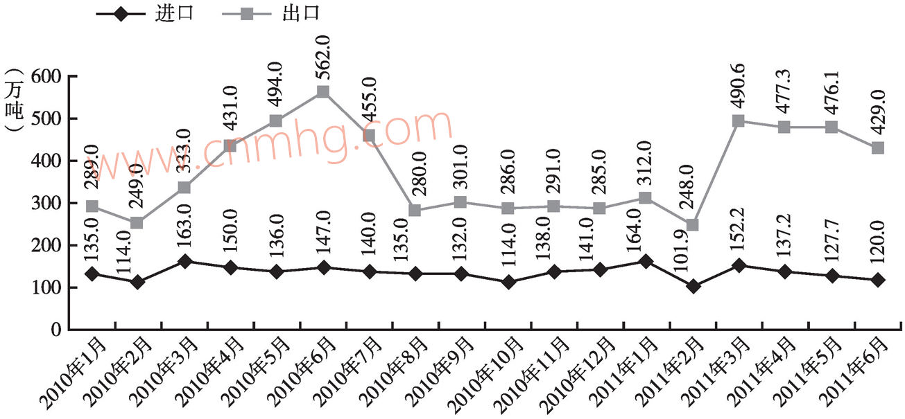 2010年鋼材全年出口4256萬噸,同比增長73.1%。6月份出口鋼材達(dá)到年內(nèi)最高的562萬噸,之后受國際市場(chǎng)鋼材價(jià)格由升轉(zhuǎn)降、需求放緩和出口調(diào)控政策的影響,我國鋼材出口迅速回落,8月至年末,月度出口量維持在300萬噸左右。2011年2月創(chuàng)下2010年以來出口248萬噸的新低,隨后3月份鋼材出口強(qiáng)勁反彈至490.6萬噸,之后逐月回落。從上半年看,累計(jì)出口鋼材2433萬噸,同比增長3.2%(圖3-3)。2010年,我國鋼材進(jìn)口相對(duì)平穩(wěn),共計(jì)進(jìn)口1645萬噸,同比下降6.9%。進(jìn)出口相抵,全年凈出口鋼材2611萬噸,比上年增長2.76倍。2011年上半年,累計(jì)進(jìn)口鋼材803萬噸,比2009年減少4.9%。同時(shí),受進(jìn)口礦價(jià)格漲幅過高和國內(nèi)礦增幅較大影響,2010年全年進(jìn)口鐵礦石6.2億噸,同比下降1.4%,鐵礦石對(duì)外依存度也由上年的69%下降到63%左右。