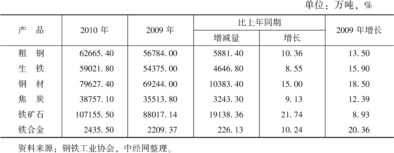 2010年,國家大力推進(jìn)產(chǎn)業(yè)結(jié)構(gòu)調(diào)整和經(jīng)濟(jì)發(fā)展方式轉(zhuǎn)變,進(jìn)一步加大了鋼鐵行業(yè)節(jié)能減排、淘汰落后產(chǎn)能工作力度。通過企業(yè)間兼并重組,鋼鐵行業(yè)集中度有所提高。一方面,在國家穩(wěn)定的宏觀經(jīng)濟(jì)及下游需求支撐下,鋼鐵行業(yè)產(chǎn)量規(guī)模穩(wěn)定增長、出口銷量逐步恢復(fù),全年粗鋼產(chǎn)量達(dá)到6.27億噸,同比增長9.26%;出口鋼材4256萬噸,同比增長73.1%。另一方面,我國鋼鐵行業(yè)整體產(chǎn)能過剩、行業(yè)集中度較低的格局沒有根本改變。