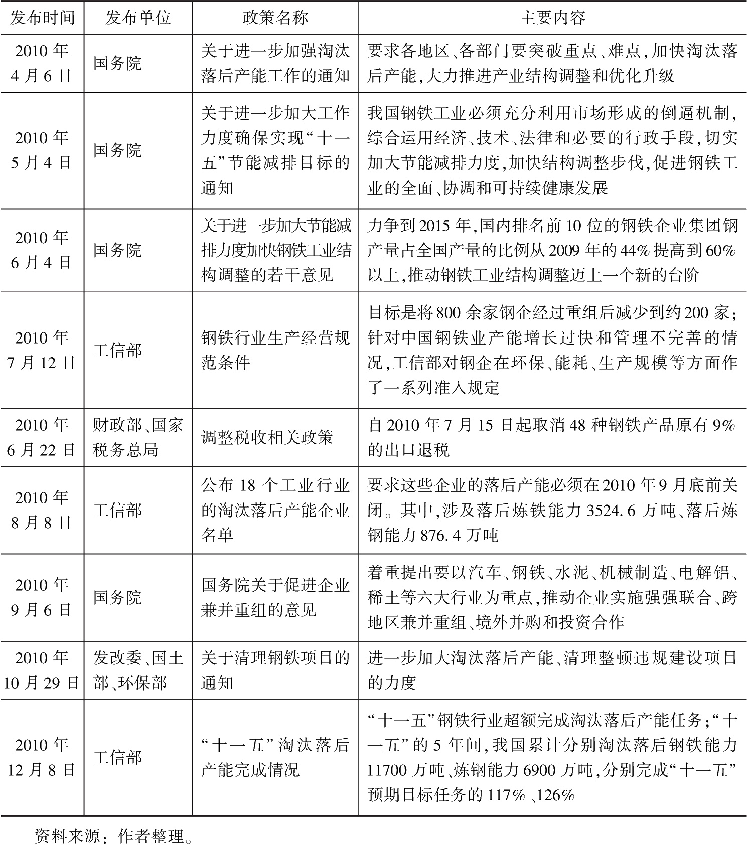 表3-8 2010年鋼鐵行業(yè)相關(guān)政策