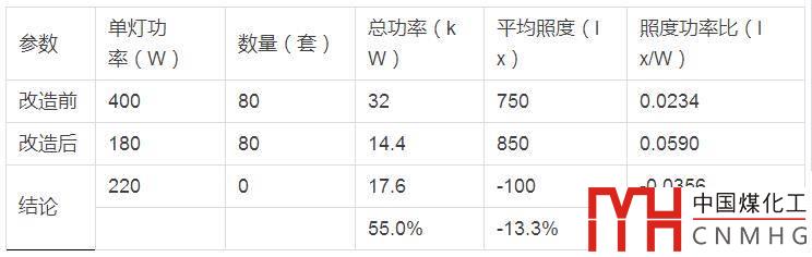 從表中可以看出,改造后的照明總功率只有14.4kW,不到原系統(tǒng)的一半;平均照度提高了100lx,達(dá)到850lx;照度功率比高達(dá)0.0590,是原系統(tǒng)的2.52倍。