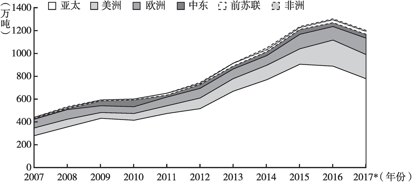 中國航煤傳統(tǒng)的出口對象為亞太區(qū)域。但近年來,在國內(nèi)航煤資源持續(xù)過剩的局面下,中國主要煉油企業(yè)積極尋求航煤出路,開拓亞太區(qū)外市場,航煤出口地區(qū)結(jié)構(gòu)悄然改變,主要體現(xiàn)為中國出口到亞太區(qū)內(nèi)的航煤數(shù)量和份額逐步回落,而出口至歐美市場的航煤數(shù)量和份額則逐步提高(見圖5)。2017年,中國對亞太的航煤出口量為778萬噸,同比下降12.8%,占中國航煤出口總量的64.5%,較上年同期下降3.6個百分點;中國對歐美的航煤出口量為361萬噸,同比增長3.7%,占中國航煤出口總量的30%,較上年同期下降3.5個百分點。