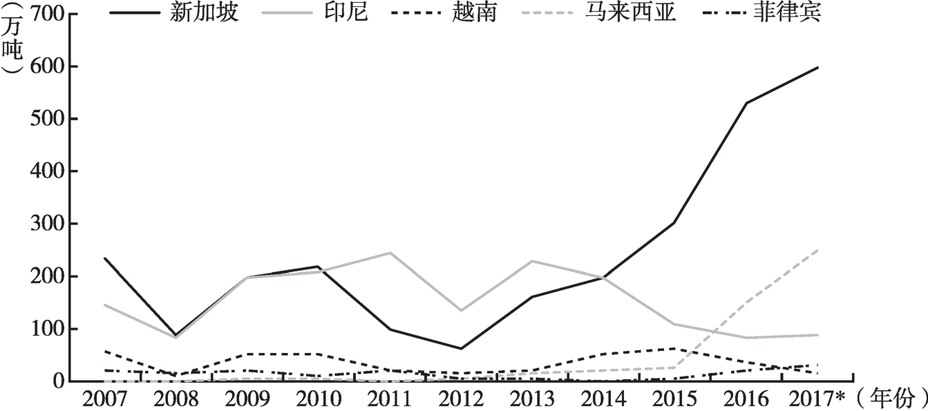 除少部分出口到哈薩克斯坦外,目前中國超過95%的汽油出口流向東南亞國家,流向前三大出口目的國新加坡、馬來西亞和印尼的占比高達90%。近年來,中國向新加坡、馬來西亞的汽油出口量增長明顯,而向印尼和越南的出口則呈下降趨勢。2017年,中國向新加坡出口汽油600萬噸,同比增長13.2%;向馬來西亞出口250萬噸,同比增長70%,馬來西亞連續(xù)兩年超過印尼,成為我國第二大汽油出口國;向印尼僅出口85萬噸,同比略增4.9%,比2011年的歷史最高水平低160萬噸;向越南出口15萬噸,同比下降53.1%(見圖3)。