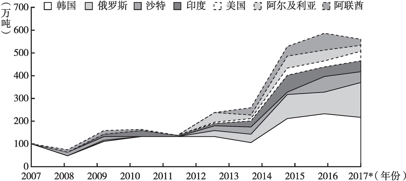 從進口來源看,韓國始終是我國石腦油第一大進口來源國。近兩年受韓國國內(nèi)PX裝置需求增加影響,中國從韓國進口增速放緩,2017年進口量為220萬噸,同比下降6%;而從俄羅斯進口呈逐年攀升的態(tài)勢,2017年進口量為150萬噸,同比增長50%。此外,從中東地區(qū)尤其是沙特和阿聯(lián)酋的進口量有所增加(見圖8)。