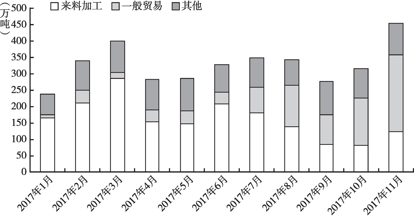 圖2 2017年來料加工出口和一般貿(mào)易出口變化趨勢