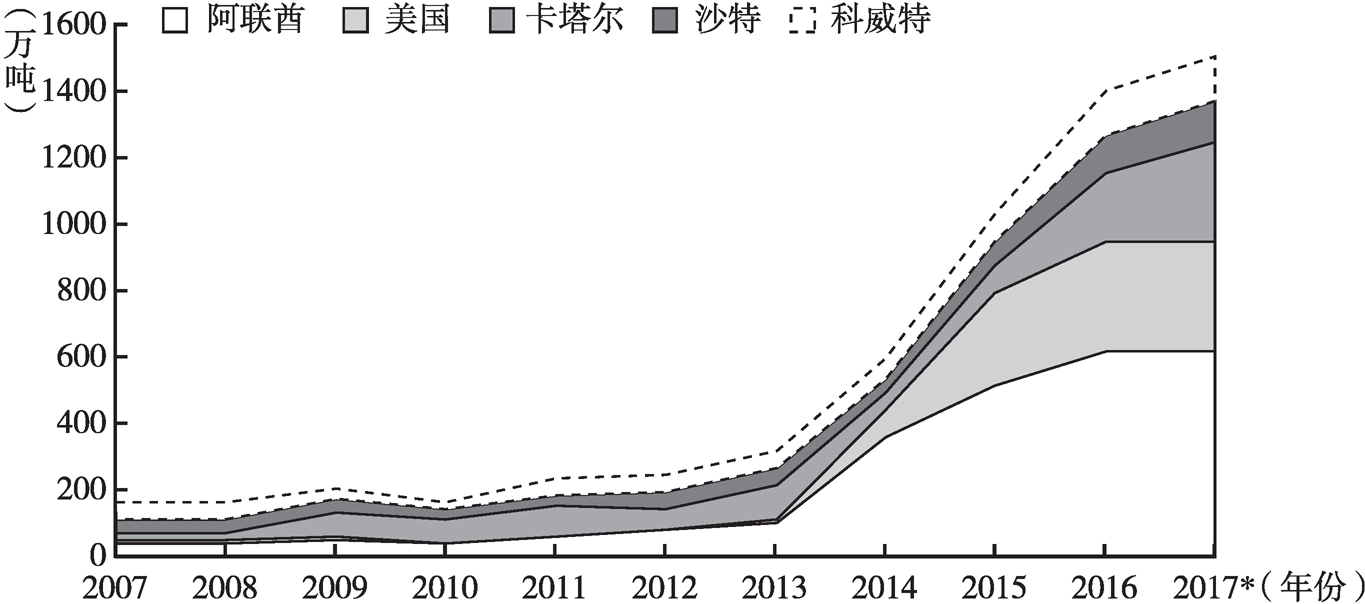 從進口來源看,我國LPG進口六成以上來自中東地區(qū)。2017年,我國自中東進口LPG1200萬噸,同比增加11%,其中以自阿聯(lián)酋、卡塔爾、科威特和沙特的進口為主。值得注意的是,2014~2016年來自美國的LPG呈快速增長趨勢,美國超過卡塔爾成為我國LPG第二大進口來源國;2017年全年從美國進口LPG 300萬噸,同比下降9.4%,占中國進口LPG總量的16.7%(見圖7)。