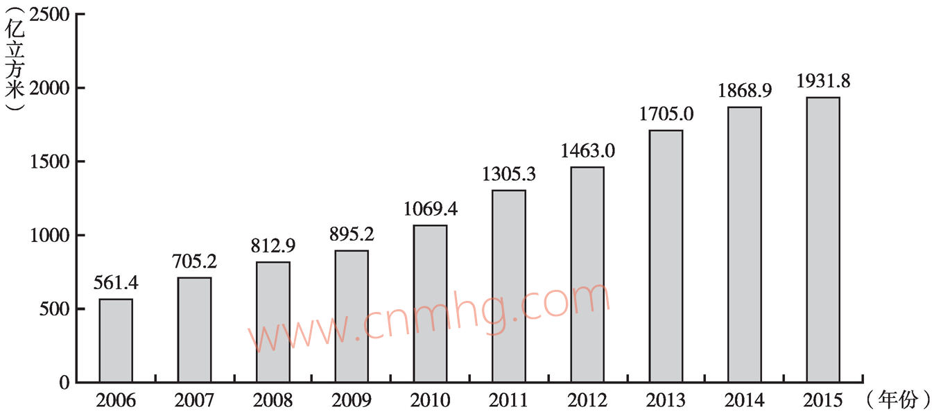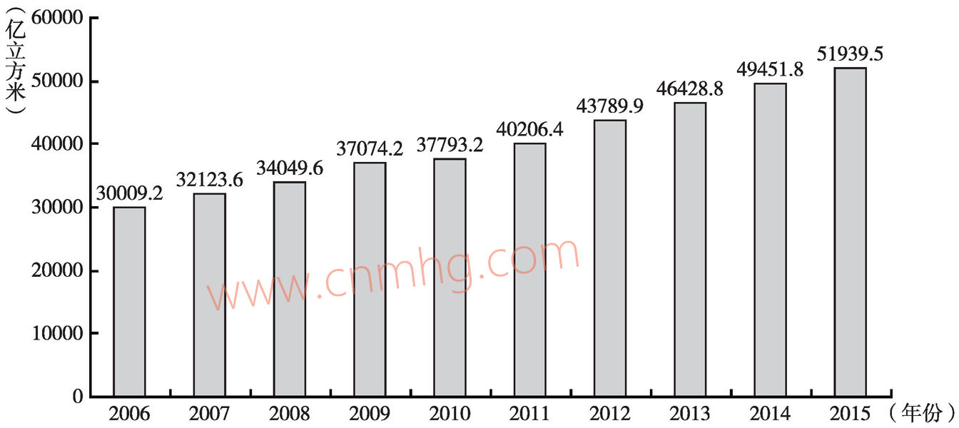 促進天然氣儲量持續(xù)提升。隨著天然氣對外依存度的不斷提升,中國將加強對天然氣勘探開發(fā)技術(shù)的研發(fā),從而提高儲量,減少對外依存度。尤其是美國“頁巖氣革命”的成功與實踐證明,非常規(guī)天然氣的發(fā)展前景一片大好。中國自2006年以來天然氣儲量不斷增長(見圖3-22),2015年達到51939.5億立方米,比2006年增長了73%,未來隨著相關(guān)技術(shù)的成熟以及能源安全意識的增強,天然氣儲量將不斷得到增長。