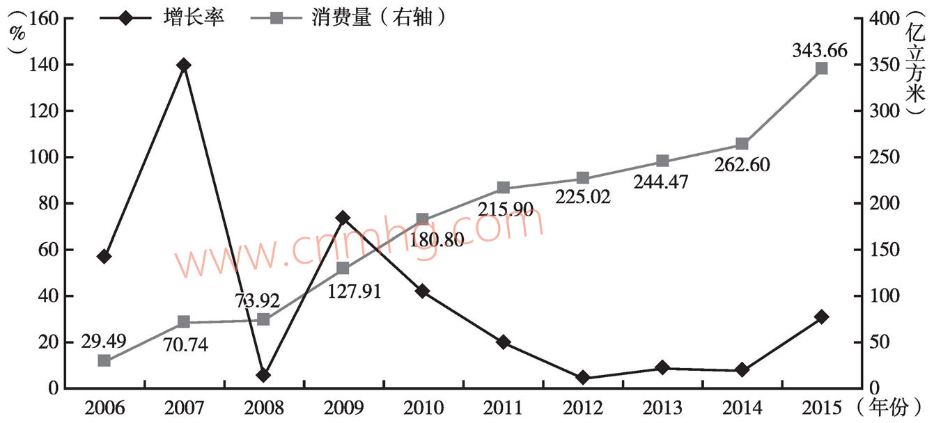 促進天然氣勘探與開發(fā)技術(shù)的進步。2006年以來中國天然氣進口量不斷攀升(見圖3-15),2015年,中國天然氣進口量為611億立方米,天然氣對外依存度約為31.6%。隨著中國能源行業(yè)改革的深入,以及人民幣國際化與天然氣現(xiàn)貨交易的不斷推進,天然氣人民幣概念將逐步走向?qū)嵺`,隨之而來的便是天然氣交易價格與國際接軌,交易成本逐步下降,天然氣進口量穩(wěn)步提升。同時,天然氣對外依存度也將不斷提高,能源安全將受到極大的挑戰(zhàn),因而將勢必激發(fā)國內(nèi)各界重視對非常規(guī)天然氣(頁巖氣、煤層氣)的勘探,倒逼天然氣相關(guān)部門加大對勘探與開發(fā)技術(shù)的研發(fā)投入,促進天然氣勘探與開發(fā)技術(shù)的進步,提高國內(nèi)天然氣行業(yè)的供給水平,緩解進口壓力。