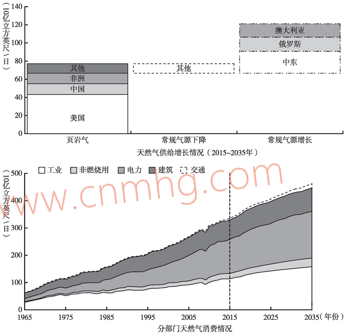 “頁巖氣革命”提高了天然氣供應(yīng)量。美國“頁巖氣革命”大大降低了天然氣開采的成本,實現(xiàn)了天然氣的大規(guī)模商業(yè)性開采。從天然氣供給增長與消費的預(yù)測來看(見圖3-3),未來天然氣供給增長中頁巖氣占60%以上,其中一半以上的頁巖氣生產(chǎn)由美國貢獻,其次是中國與非洲等國家和地區(qū)。根據(jù)BP《世界能源展望(2017)》中的數(shù)據(jù),到2035年,美國的頁巖氣供給量可達到430億立方英尺/日。從天然氣消費的部門來看,增長較快的主要是工業(yè)與電力部門,其中工業(yè)部門的貢獻占比為45%左右,電力部門的貢獻占比為36%左右。