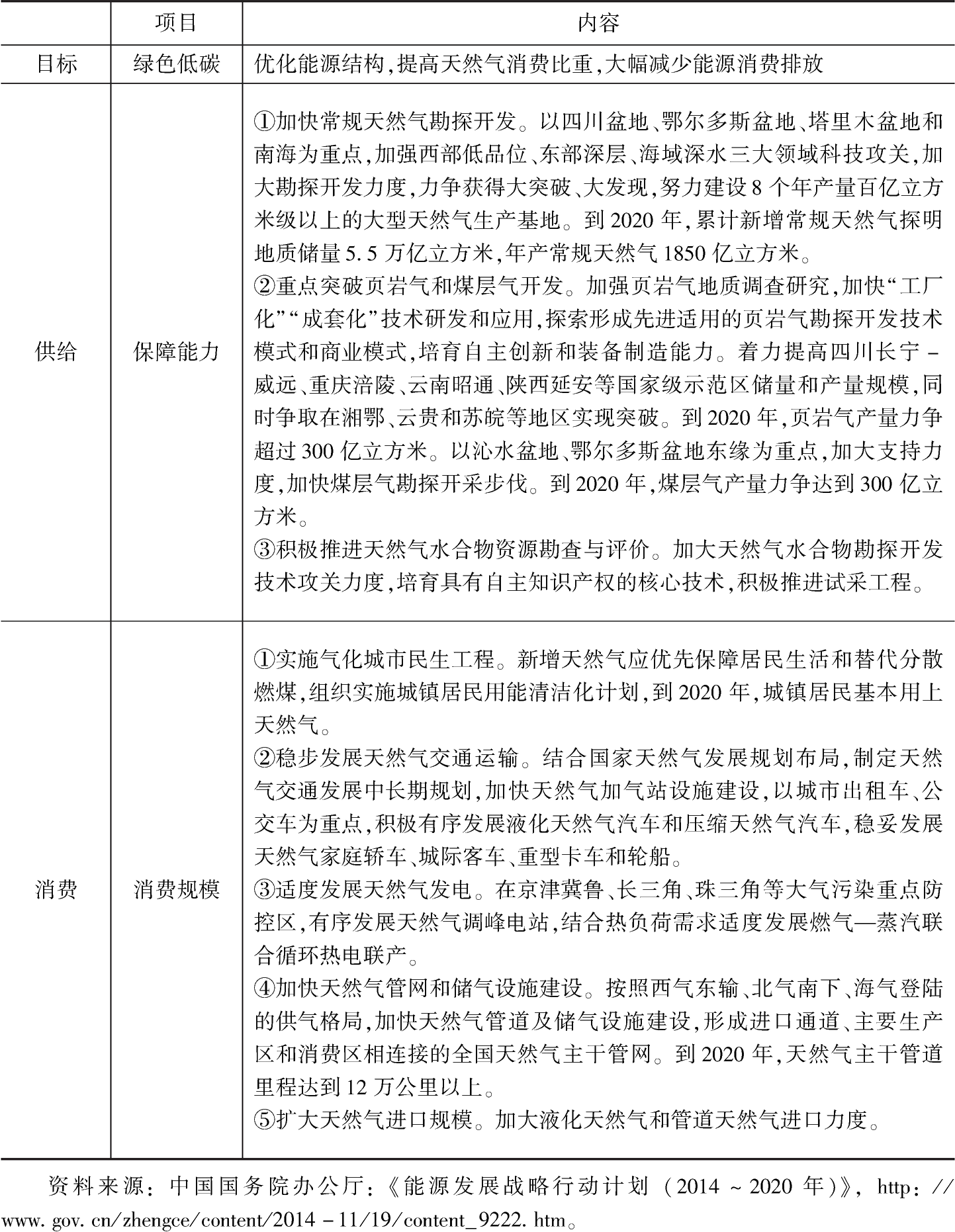 早在2014年,中國國務(wù)院辦公廳就印發(fā)了《能源發(fā)展戰(zhàn)略行動計劃(2014~2020年)》(國辦發(fā)〔2014〕31號),從綠色低碳、供給保障以及消費增長等幾個方面對未來中國天然氣的發(fā)展進行了規(guī)劃。具體來看(見表3-1),該計劃肯定了天然氣在優(yōu)化能源結(jié)構(gòu)、減少碳排放方面的作用,提出了大力發(fā)展天然氣的主要任務(wù)。增強供給保障能力方面,該計劃提出“按照陸地與海域并舉、常規(guī)與非常規(guī)并重的原則,加快常規(guī)天然氣增儲上產(chǎn),盡快突破非常規(guī)天然氣發(fā)展瓶頸,促進天然氣儲量產(chǎn)量快速增長”。同時,該計劃從加快常規(guī)天然氣勘探開發(fā)、重點突破頁巖氣和煤層氣開發(fā)、積極推進天然氣水合物資源勘查與評價三個方面提出了提高天然氣供給的途徑。消費增長方面,該計劃提出的目標是“堅持增加供應(yīng)與提高能效相結(jié)合,加強供氣設(shè)施建設(shè),擴大天然氣進口,有序拓展天然氣城鎮(zhèn)燃氣應(yīng)用。到2020年,天然氣在一次能源消費中的比重提高到10%以上”,并從擴大居民用氣規(guī)模、完善交通運輸保障、拓展天然氣用途等方面對擴大天然氣消費市場做了相應(yīng)的部署。