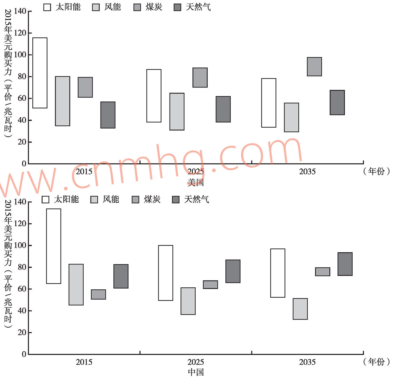 圖3-16 中國、美國各類能源新建發(fā)電廠發(fā)電成本對比