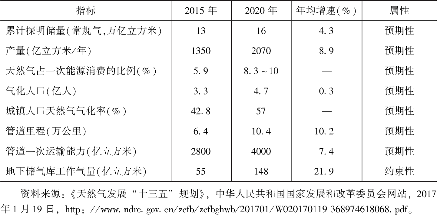 按照《能源發(fā)展“十三五”規(guī)劃》的目標(見表3-2),2020年,天然氣在中國能源結(jié)構(gòu)中的占比要從2015年的5.9%提高到10%,即天然氣年均消費增長要保持在4.1%左右。同時,該計劃提出要擴大天然氣消費市場,尤其是提高民用、發(fā)電、交通和工業(yè)等領(lǐng)域的天然氣消費水平,進一步推進天然氣市場化改革的進程,改革天然氣定價機制,加大對天然氣管網(wǎng)等基礎(chǔ)設(shè)施的投入力度,并以京津冀等國家戰(zhàn)略區(qū)域為重點實施“煤改氣”工程,加大頁巖氣等技術(shù)的研發(fā),提升國內(nèi)天然氣的供給水平,以及降低用氣成本等。