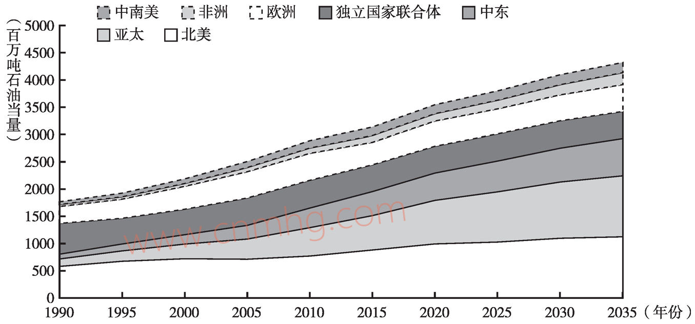 全球天然氣消費占比不斷提高。從未來一次能源消費結(jié)構(gòu)的預(yù)測來看(見圖3-1),到2035年,一次能源消費結(jié)構(gòu)將更加多樣化,石油、天然氣、煤炭為主要的消費能源。這說明能源消費仍以化石能源為主,短期內(nèi)新能源仍無法取代化石能源的地位。從未來一次能源消費占比的預(yù)測來看(見圖3-2),石油、煤炭在一次能源消費中的占比不斷下降,而天然氣與可再生能源的占比不斷提高。根據(jù)BP《世界能源展望(2017)》中的數(shù)據(jù),天然氣為增長速度最快的化石能源,年均增長率為1.6%左右,將在2035年前成為超越煤炭的第二大消費能源;可再生能源為增長速度最快的能源,年均增長率為7.1%,到2035年,其在一次能源消費中的占比將達到10%左右。