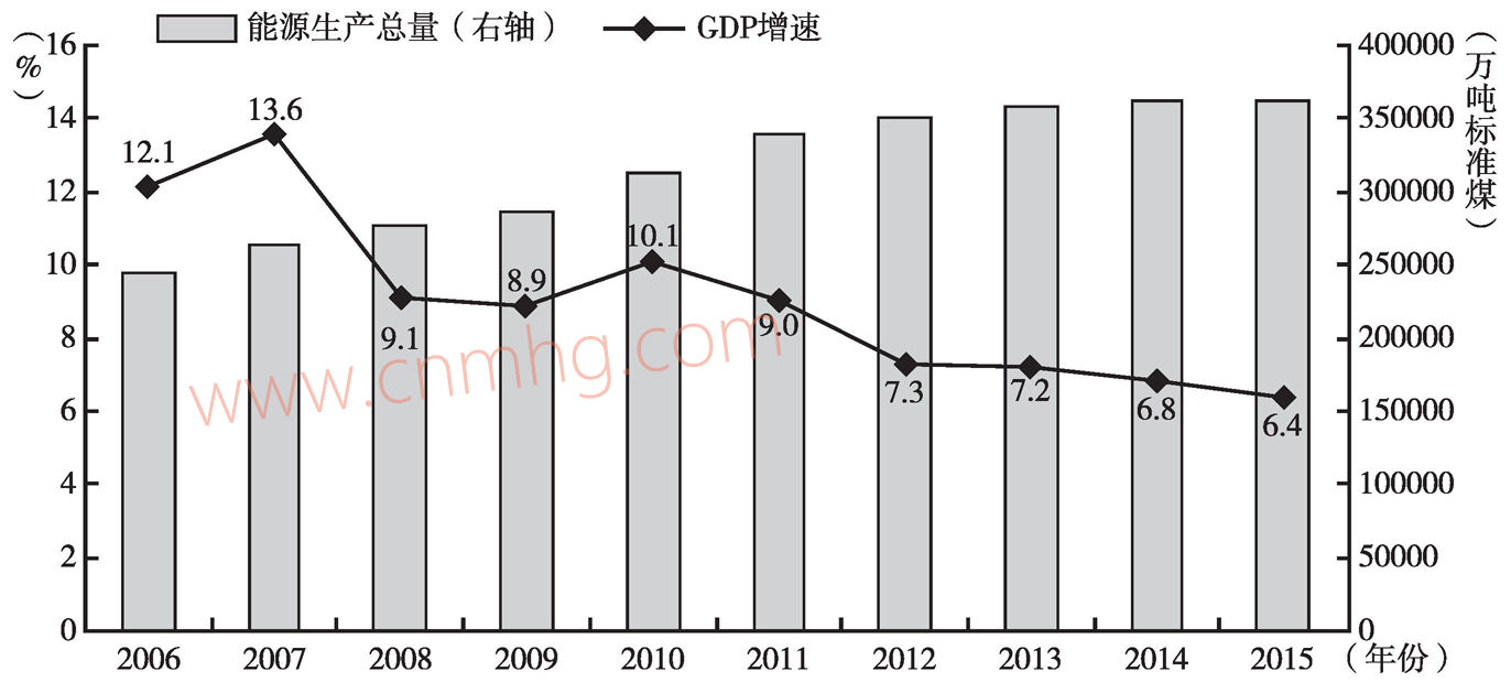 圖3-19 中國能源生產(chǎn)總量與經(jīng)濟增長的變化