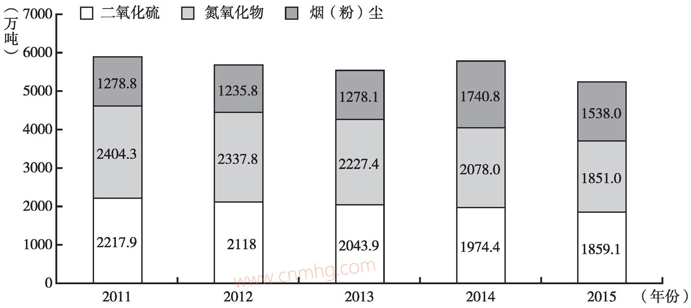 加快相關(guān)行業(yè)向綠色低碳化方向發(fā)展。近年來,中國多地飽受霧霾問題的困擾,尤其是冬季集中供暖期間,北方的霧霾天氣隨之增多。引起霧霾的一個重要原因是煤炭的消費,另外,因汽車消費量不斷增長,汽車尾氣排放所產(chǎn)生的氮氧化物也成為大氣污染的重要原因之一。雖然粉塵、氮氧化物等污染物的排放量在逐年減少(見圖3-17),但2015年中國大氣污染物排放總量仍為5248.1萬噸,并且污染物排放量的下降速度比較緩慢。而天然氣作為一種清潔能源,尤其是未來天然氣在一次能源消費中占比的不斷提高,將降低煤炭與石油在一些高污染領(lǐng)域的使用,進而促進相關(guān)行業(yè)的發(fā)展方式向綠色低碳化方向轉(zhuǎn)變。天然氣人民幣引起的天然氣消費量的增長一定程度上將提高相關(guān)行業(yè)使用清潔能源的比例,加速實現(xiàn)經(jīng)濟的綠色低碳化發(fā)展。