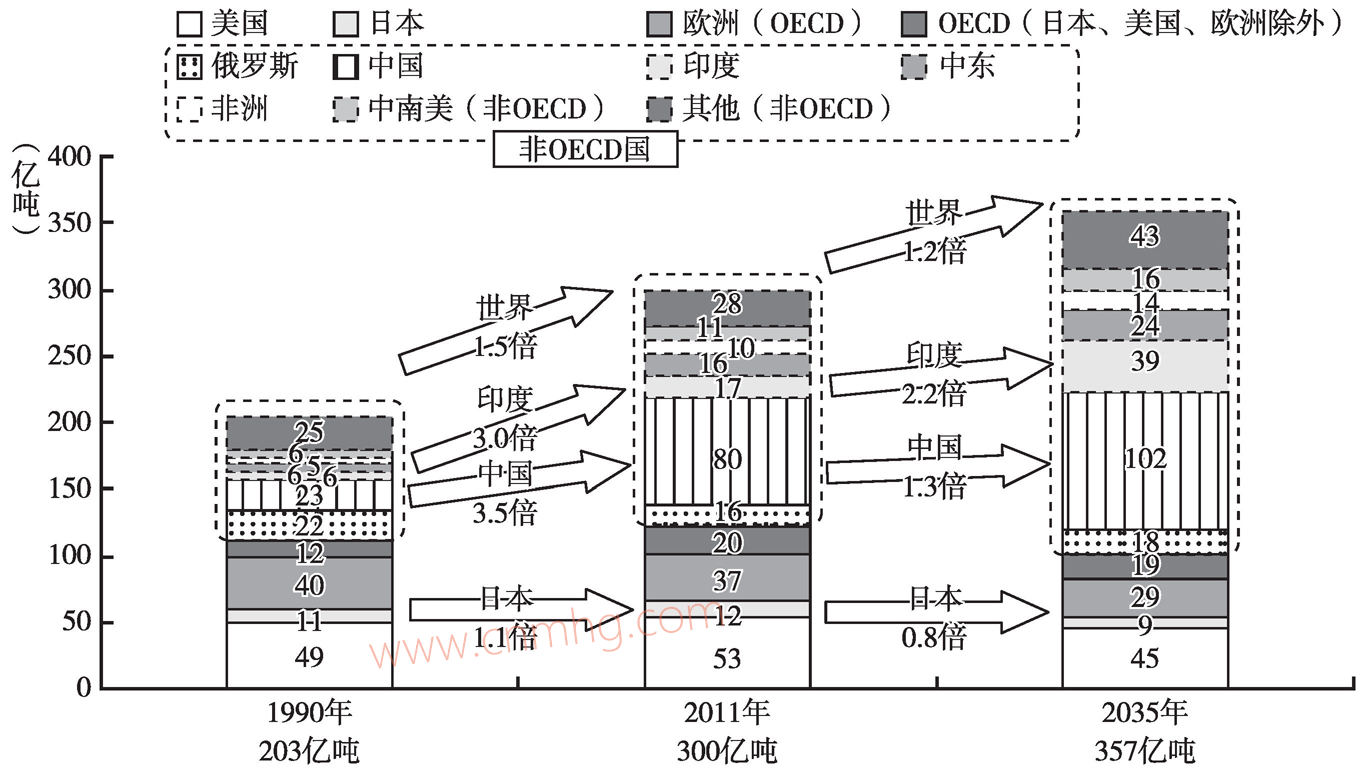 碳排放的減少有賴于清潔能源的使用。從世界二氧化碳(CO2)排放量的變化及預(yù)測來看(見圖3-9),1990年世界CO2排放量為203億噸,到2011年達到300億噸,約為1990年的1.5倍,根據(jù)預(yù)測,2035年將達到357億噸,世界總體將增長19%左右。從各國的CO2排放量來看,中國2011年的排放量是1990年的3.5倍,根據(jù)預(yù)測,2035年是2011年的1.3倍;印度2011年的排放量是1990年的3倍,根據(jù)預(yù)測,2035年是2011年的2.2倍;日本等發(fā)達國家2035年CO2排放量與2011年相比將均呈現(xiàn)下降的趨勢。
