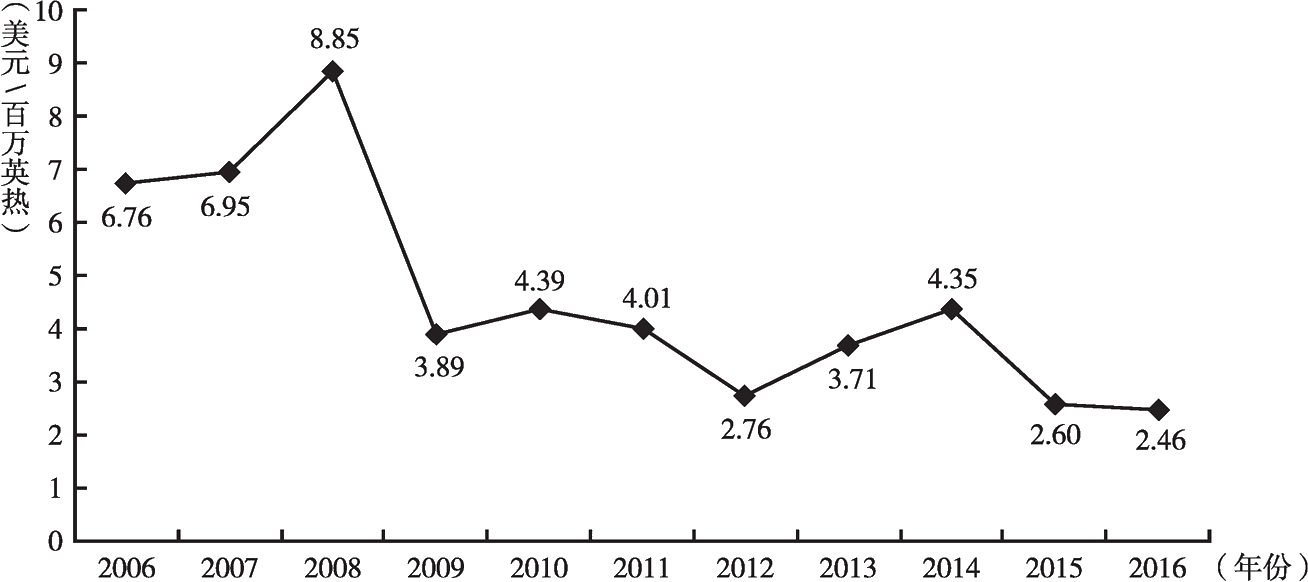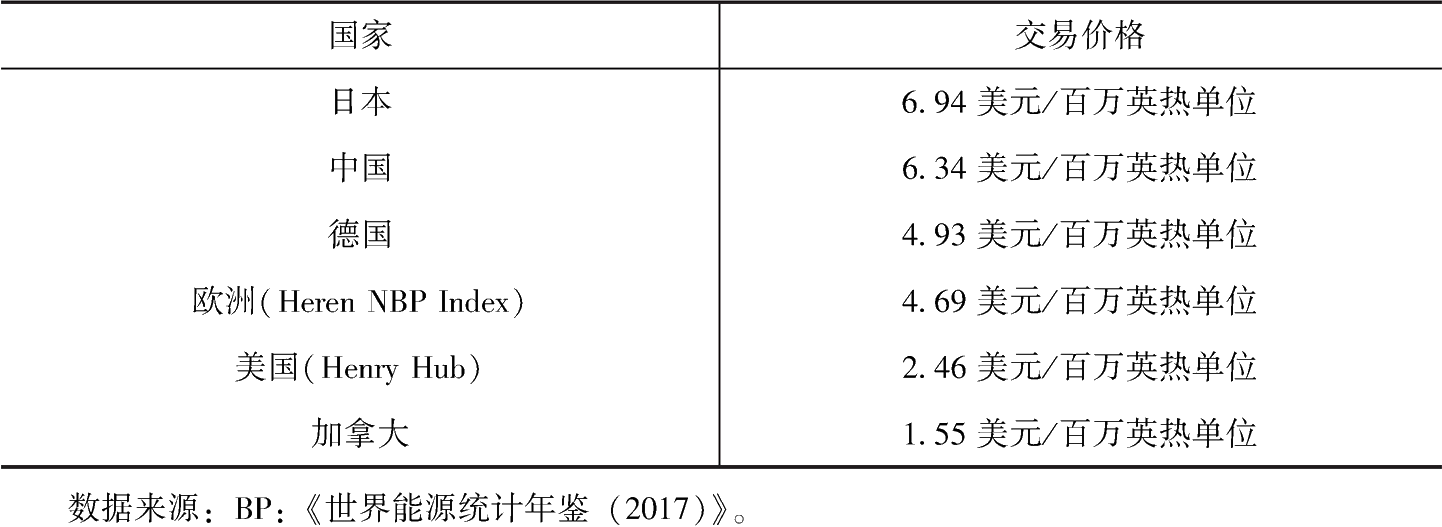 推進天然氣定價方式轉(zhuǎn)變。從2006年以來美國亨利樞紐(Henry Hub)天然氣交易價格的變化來看(見圖3-13),自2008年金融危機以來,天然氣交易價格持續(xù)走低,尤其是近年美國“頁巖氣革命”的成功更是大大降低了天然氣的使用成本,2016年,美國天然氣的交易價格為2.46美元/百萬英熱單位,而中國天然氣的交易價格大約為6.34美元/百萬英熱單位[3],遠遠高于美國。此外,從2016年各地區(qū)天然氣的交易價格來看(見表3-5),美國與歐洲地區(qū)的交易價格普遍低于中國與日本,原因在于美國為現(xiàn)貨交易市場,市場競爭較為激烈,天然氣價格相對較為合理,一定程度上避免了溢價的產(chǎn)生,而中國與日本的天然氣交易方式為“照付不議”的市場定價方式,國際低氣價紅利引入國內(nèi)的效果并不明顯。天然氣人民幣在加快亞太地區(qū)天然氣交易中心建設(shè)的同時,將推進亞太地區(qū)天然氣“照付不議”的市場定價方式向現(xiàn)貨交易方式轉(zhuǎn)變,更大限度地引入國際低氣價紅利。