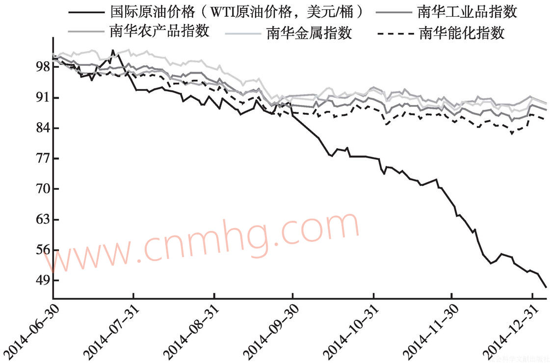 圖2.10 石油與其他大宗商品價(jià)格走勢(shì)對(duì)比(2014年6月~2014年12月)