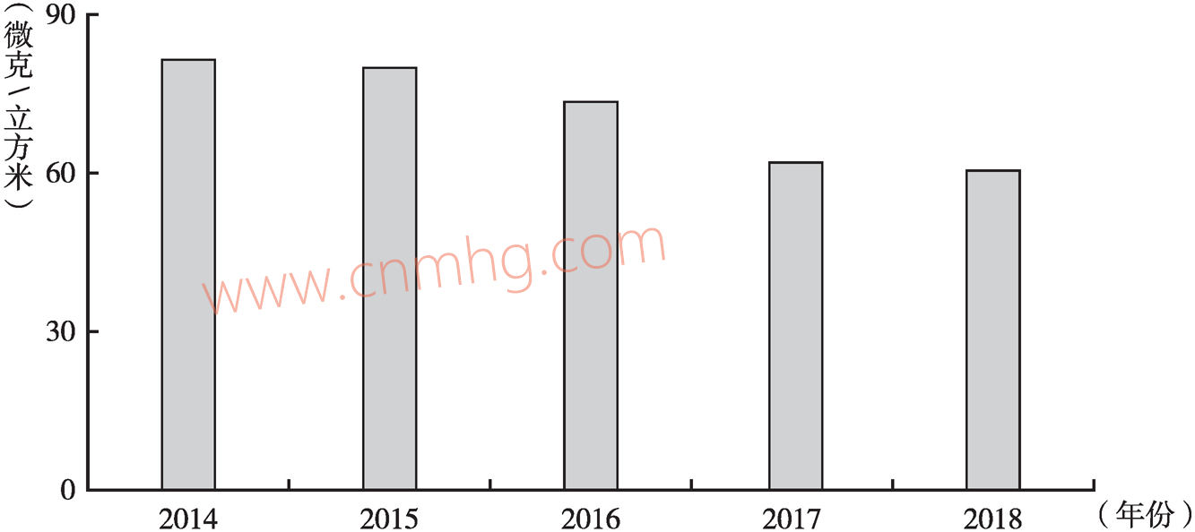 自2014年全省監(jiān)測(cè)細(xì)顆粒物以來(lái),細(xì)顆粒物年均濃度總體呈現(xiàn)下降趨勢(shì)(見(jiàn)圖7),2018年較2014年降低約25.6%,為61微克/立方米,但距離國(guó)家二級(jí)標(biāo)準(zhǔn)35微克/立方米仍有很大差距。