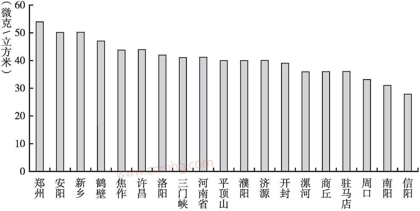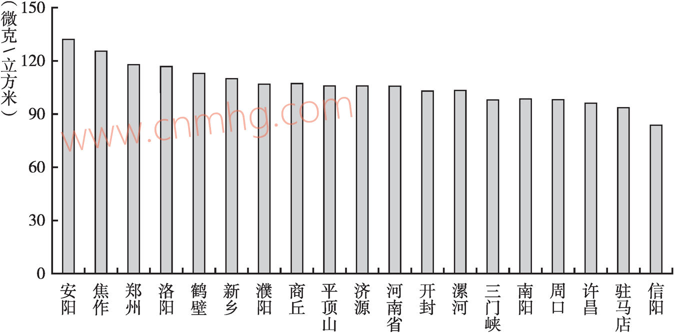 圖6 2017年河南省18個(gè)地市可吸入顆粒物年均濃度