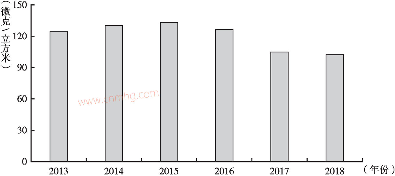 2018年,全省可吸入顆粒物年均濃度為103微克/立方米,整體呈現(xiàn)下降趨勢(shì),2018年較2013年下降18.9%,較2014年下降22.0%(見(jiàn)圖5)。