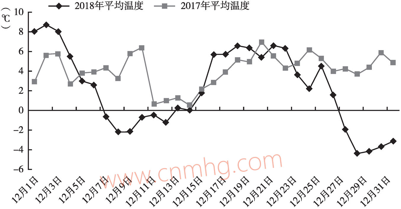 圖3 2017年12月、2018年12月河南省日平均溫度對比