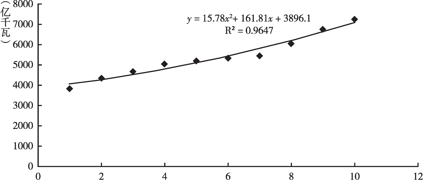 其中x為時(shí)間序列號(2010年時(shí)x=1,以此類推),y為最大負(fù)荷值,R2為擬合優(yōu)度。據(jù)此,預(yù)計(jì)2019年全省全社會(huì)最大負(fù)荷為7320萬千瓦,同比增長8.4%。