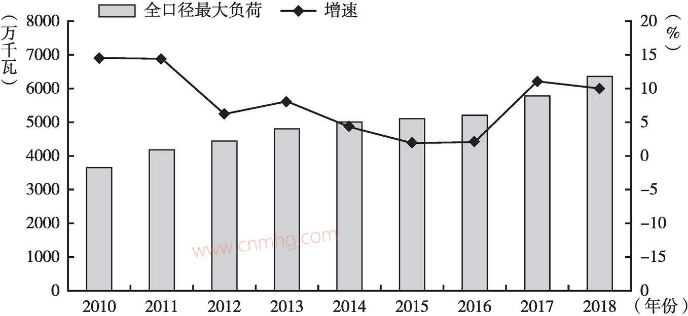 圖5 2010~2018年河南省網(wǎng)最大負(fù)荷增長情況