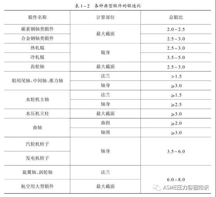 為保證鍛件質(zhì)量,簡(jiǎn)化鍛造工序,應(yīng)根據(jù)鍛件的用途適當(dāng)選擇鍛造比的大小,見表1-2。
