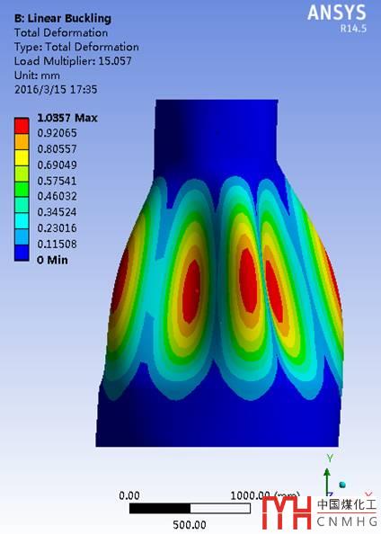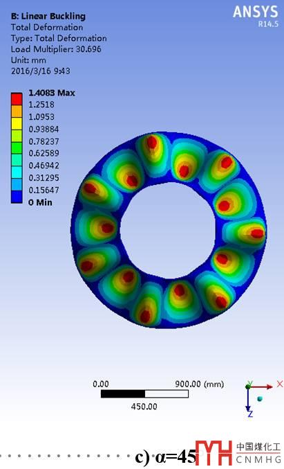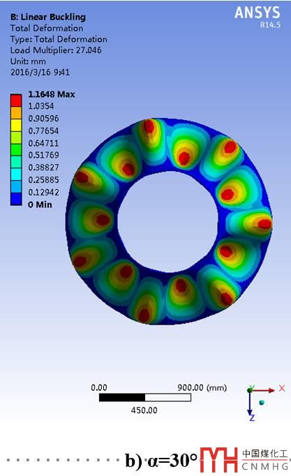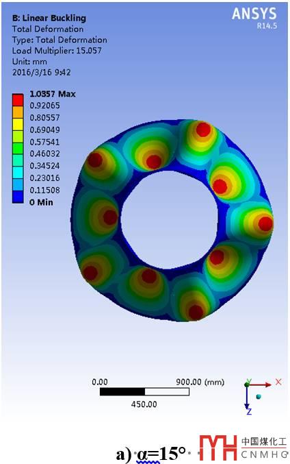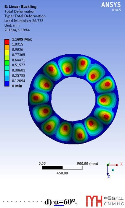 采用特征值屈曲分析方法進(jìn)行失穩(wěn)分析,計(jì)算理想線彈性結(jié)構(gòu)的理論屈曲強(qiáng)度,且由于其不考慮任何非線性,如初始幾何缺陷、材料非線性及狀態(tài)非線性等,因而其解為屈曲載荷的上限[6]。不同半錐角下(大小端筒體內(nèi)徑保持不變)筒錐結(jié)構(gòu)的一階屈曲失穩(wěn)模態(tài)云圖如下(圖6)。