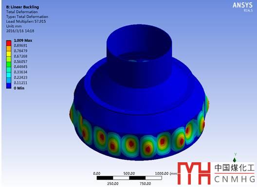 由圖8可看出,當(dāng)加強(qiáng)圈位于錐殼大小端時(shí),錐殼的失穩(wěn)臨界載荷為3.3077MPa,較無(wú)加強(qiáng)圈時(shí)的3.0696MPa并沒(méi)有太大的增加,錐殼外壓承載能力沒(méi)有得到顯著的提高;而當(dāng)加強(qiáng)圈位于錐殼上時(shí),大端筒體優(yōu)先出現(xiàn)失穩(wěn)現(xiàn)象,失穩(wěn)臨界載荷提升到5.7915MPa,錐殼的外壓承載能力得到了顯著提高。由圖7周向應(yīng)力分布情況分析可知:加強(qiáng)圈位于大小端時(shí),錐殼上的周向壓縮應(yīng)力值在約250mm之前較