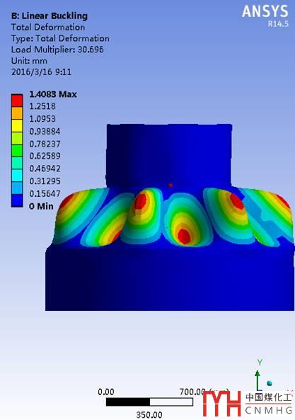 圖8 加強(qiáng)圈位于大小端及錐殼上時(shí)屈曲失穩(wěn)模態(tài)云圖