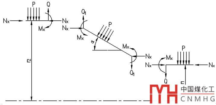 對(duì)于圓筒與錐殼連接結(jié)構(gòu),除需按上述進(jìn)行加強(qiáng)設(shè)計(jì)以校核加強(qiáng)面積是否能夠承受最大軸向和周向壓縮應(yīng)力以外,還需滿(mǎn)足外壓引起的周向穩(wěn)定性的要求,即需校核連接處是否有足夠的慣性矩以保證在壓縮應(yīng)力作用下不致產(chǎn)生周向失穩(wěn)。外壓筒錐結(jié)構(gòu)的載荷分布分析如下(圖2):