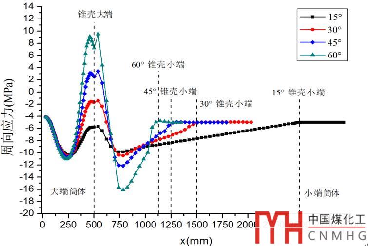 由上述可知,外壓錐殼的穩(wěn)定性系由周向壓縮應(yīng)力決定的。因而通過(guò)有限元法得出大端筒體、錐殼及小端筒體的周向應(yīng)力在不同半錐角下的變化趨勢(shì)(圖5)。